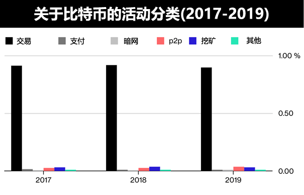 根据 Chainalysis统计数据(下图所示),2017至2019的3年间,比特币用于商家支付的比例只有约1.5%,而比特币用于交易所相关的交易活动高达90%,而比特币被用于**、P2P借贷、挖矿等其他活动约占了8.5%!