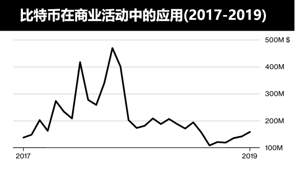 另外,从下图表可以发现,比特币被用于支付的比例和比特币的价格有很强的关联性,比特币在2017年底创出2万美元高点,商家服务于2017年底4.69亿美元达到高峰,此后一路下滑。商家服务于2019年后跌至低点后逐渐回升,但2019年5月1日1.57 亿美元与高峰相比,仍相差3倍。