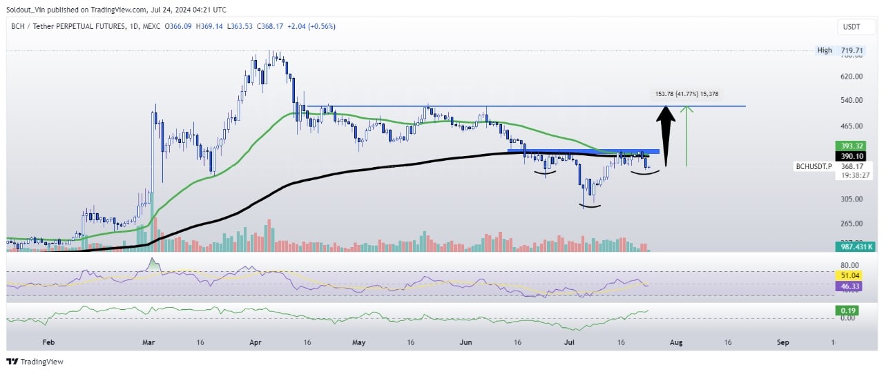 BCH 的价格走势从 4 月中旬的峰值开始下降,但最近的价格走势表明可能正在形成潜在的反转模式。价格似乎正在完成倒头肩形态的右肩,暗示可能出现看涨反转。