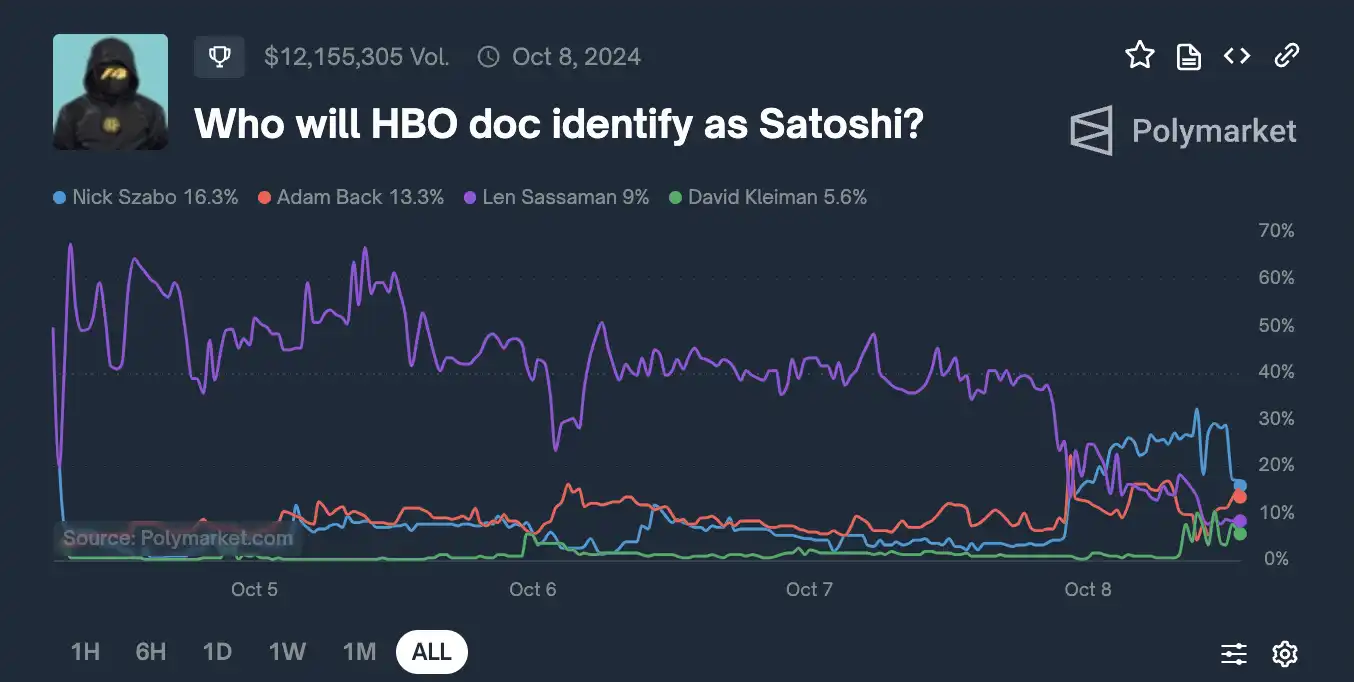 该片由艾美奖提名者、《Q:走进风暴》导演卡伦·霍巴克 (Cullen Hoback) 执导。目前 Polymarket 上用户认为 Len Sassaman 将会是这部纪录片中所揭示的「中本聪」。据悉,Len Sassaman 在与抑郁症斗争后于 2011 年自杀,因为他长期发表有关密码学的学术著作,这些著作常常显示出他对隐私和去**化的坚定意识形态承诺,所以有人认为他就是中本聪。