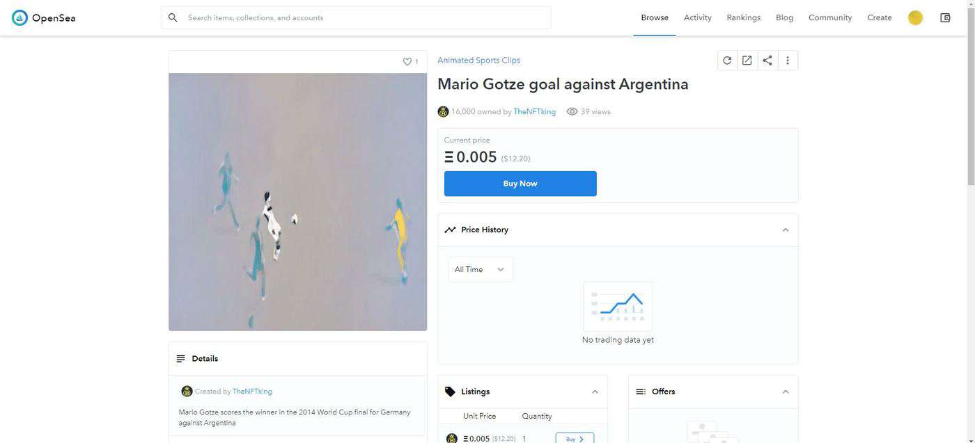 我们将要购买的 NFT 是一种“立即购买”的 NFT。作为一名狂热的体育迷,我决定购买一个 NFT,以纪念马里奥·格策 (Mario Gotze) 令人难忘的制胜进球,该进球让德国队在 2014 年世界杯上战胜了阿根廷队。我所要做的就是点击“立即购买”并确认 MetaMask 上的提示,中提琴,我现在是动画体育时刻的骄傲新主人。