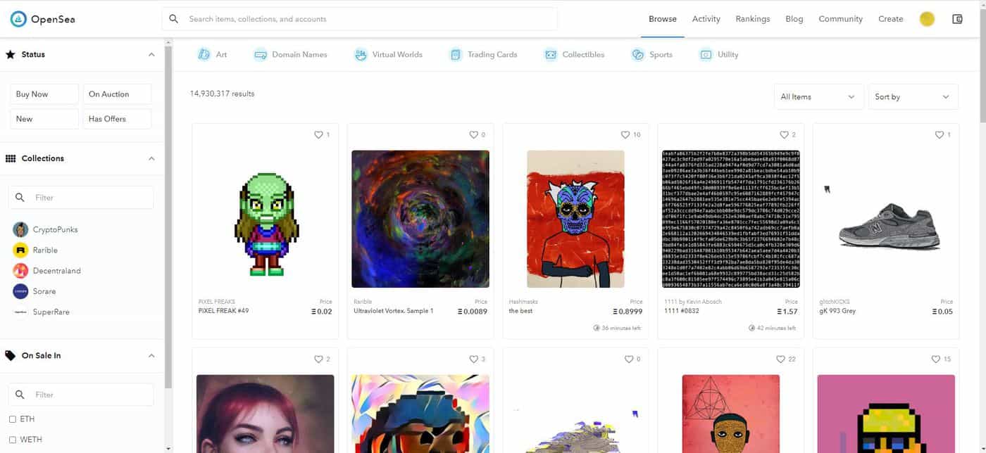 您会注意到主菜单栏上有一些选项,例如“立即购买”和“拍卖”/这是因为 OpenSea 允许创作者直接或通过拍卖出售 NFT。OpenSea 和其他市场也采用类似的“蓝色复选标记”系统,Twitter 和 Instagram 使用该系统来验证知名人士的身份。