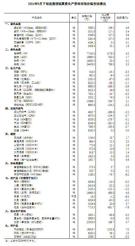 9月下旬流通领域重要生产资料价格:26种产品价格上涨 21种下降 作者:LR •更新时间:2024-10-09 10:16:47•阅读 0 财经10月9日讯 据****网站消息,据对**流通领域9大类50种重要生产资料市场价格的监测显示,2024年9月下旬与9月中旬相比,26种产品价格上涨,21种下降,3种持平。