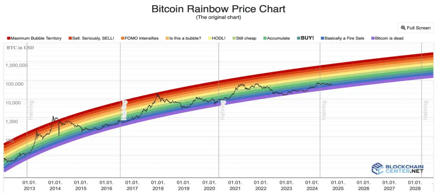 BlockchainCenter 的比特币彩虹价格图表