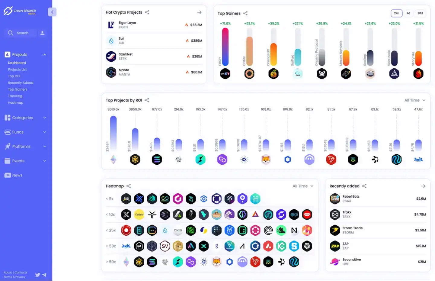ChainBroker 是一个旨在跟踪网络和 Token 各种金融指标的服务。它使用户能够分析市场状况、投资者活动和平台参与度。该网站还在某些类别中提供热力图,提供对网络和资产在一段时间内或特定时期潜力的视觉评估。