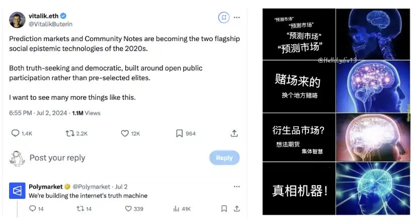 Vitalik Buterin 可能是 Web3 世界最有影响力的预测市场倡导者。早在 2014 年,他便将预测市场当作 Futarchy (Robin Hanson 设想的一种以**治国的未来政府形式) 的一种实践进行了讨论;在 2020 年的一篇探索「可信中立」机制的文章中,他再次将预测市场作为案例,随后还提出了一种将极不可能事件绑定下注的预测市场设计;2021 年,他发文系统论述了预测市场的价值支撑以及去**化的优势;本周期以来,他更是**公开表示对预测市场的看好,并参投了 Polymarket 在今年 5 月的 B 轮融资。