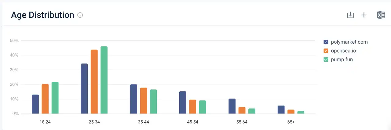Polymarket, Opensea, pump.fun 的用户年龄构成 来源: similarweb