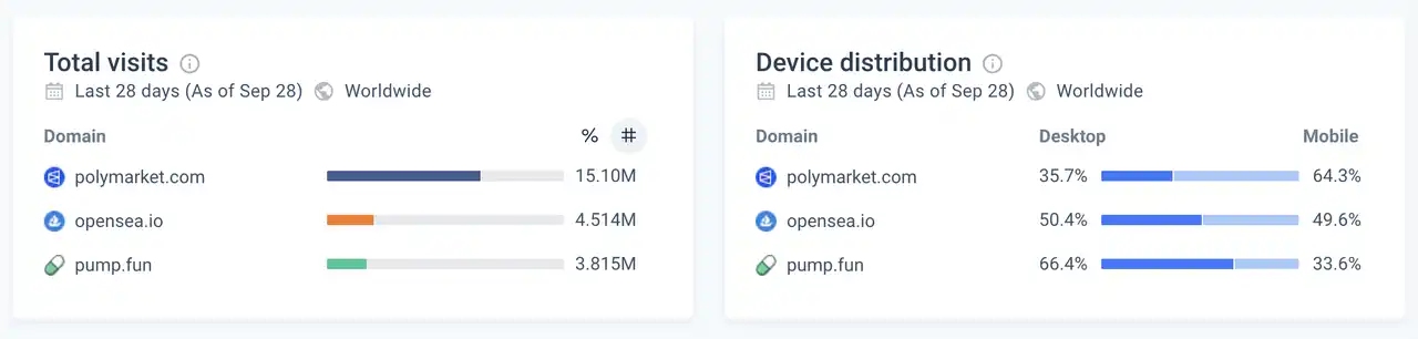 如果加入 pump.fun,进一步对比这三个各自赛道内的明星产品,可以发现 Polymarket 的访问量,以及来自移动端的比例要明显高于其他两者——反映了 Polymarket 背后大概率有一个与 NFT 交易者和 meme 玩家不同的「读报人群」。