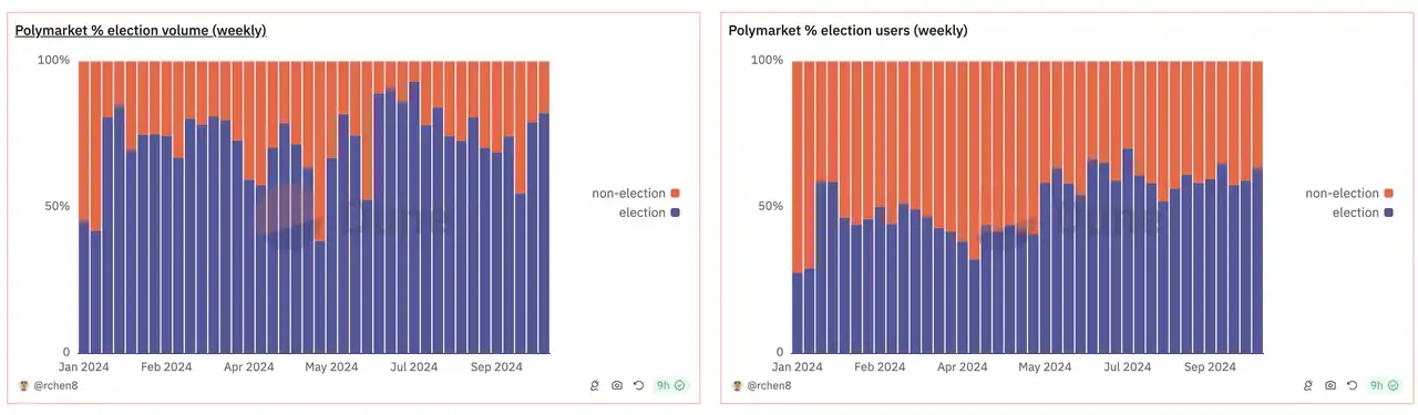 Polymarket 上选举相关的交易量达到了 70%,用户量达到了 60%