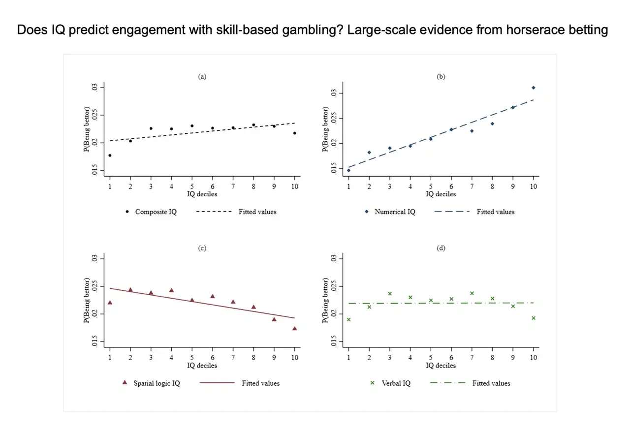 一篇发表于 2022 年、面向超过 4 万芬兰居民在线赛马**行为的研究显示,拥有更高数值 IQ (即在算数推理、数学问题解决和定量分析测量中表现更好) 的人会对基于技能的** (与之相对的是基于运气的**) 呈现出明显更高的参与意愿。该研究还显示,在总下注人群中,约 9% 的玩家收益大于损失。在 Polymarket 中,这一比例为 11.5%。