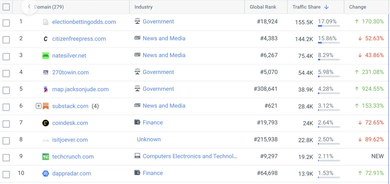 Polymarket 广告链接来源排名前 10 的网站