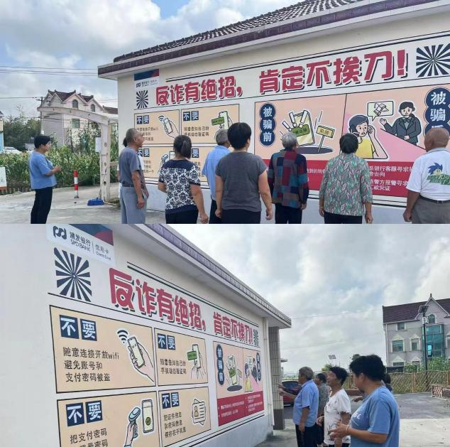 “**有绝招,肯定不挨‘刀’”,鲜艳的字体配上简洁易懂的漫画,吸引了来来往往众多村民的驻足观看。不同于常规的讲座或传单发放,浦发信用卡选择了一种更加贴近村民生活、易于被广泛接受的形式,将精心编排的防诈指南转化为图文并茂的墙绘,巧妙地绘制于万祥镇人流量大的房屋墙面,通过“墙面”的连接,金融消保宣教不再局限于特定的时间和场所,而是渗透进村民的生活空间,真正做到了“随时随地学金融”。