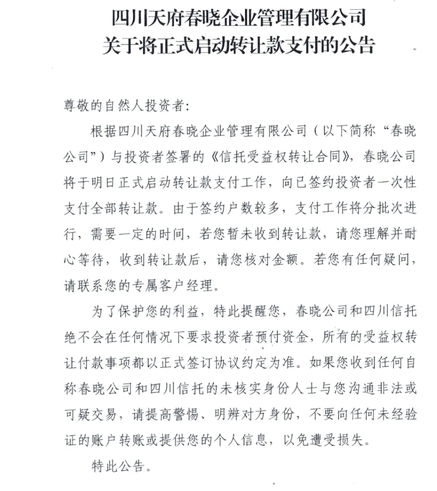 财经10月10日讯 今日,四川信托发布相关公告表示,根据四川天府春晓企业管理有限公司(以下简称“春晓公司”与投资者签署的《信托受益权转让合同》,春晓公司将于明日正式启动转让款支付工作,向已签约投资者一次性支付**转让款。