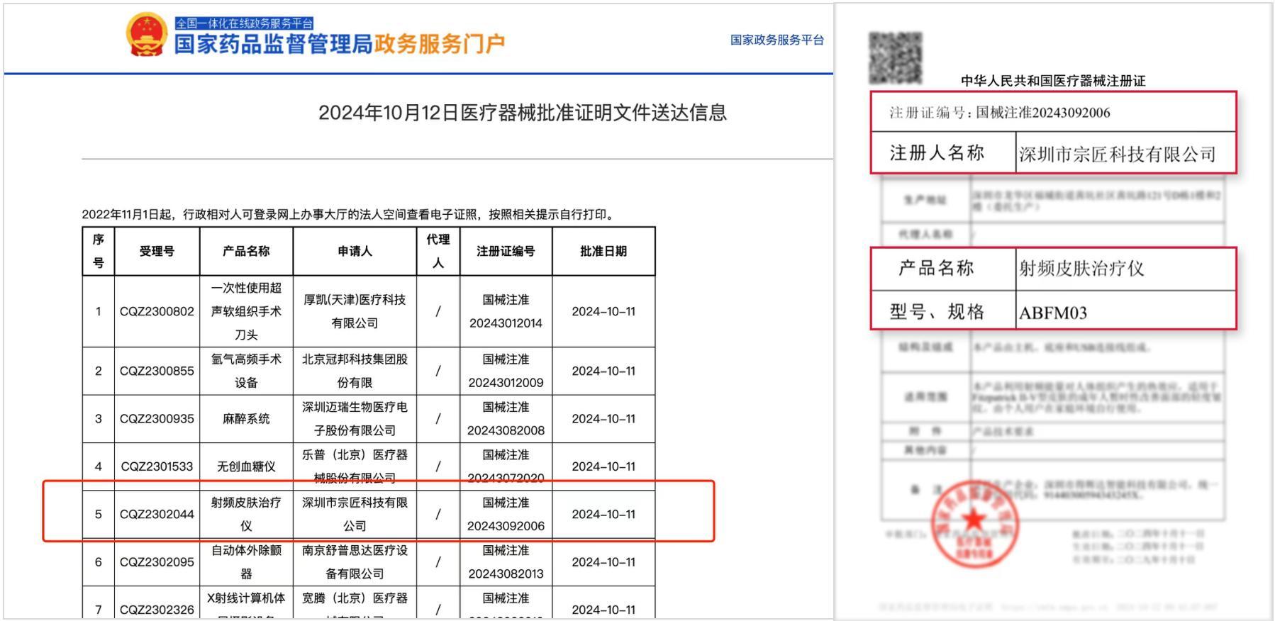 10月12日,**药监局发布医疗器械批准证明文件送达信息,批准深圳市宗匠科技有限公司(下称宗匠科技旗下手持式射频皮肤**仪的三类医疗器械注册申请,AMIRO觅光成为首批“取证”的家用美容仪品牌。