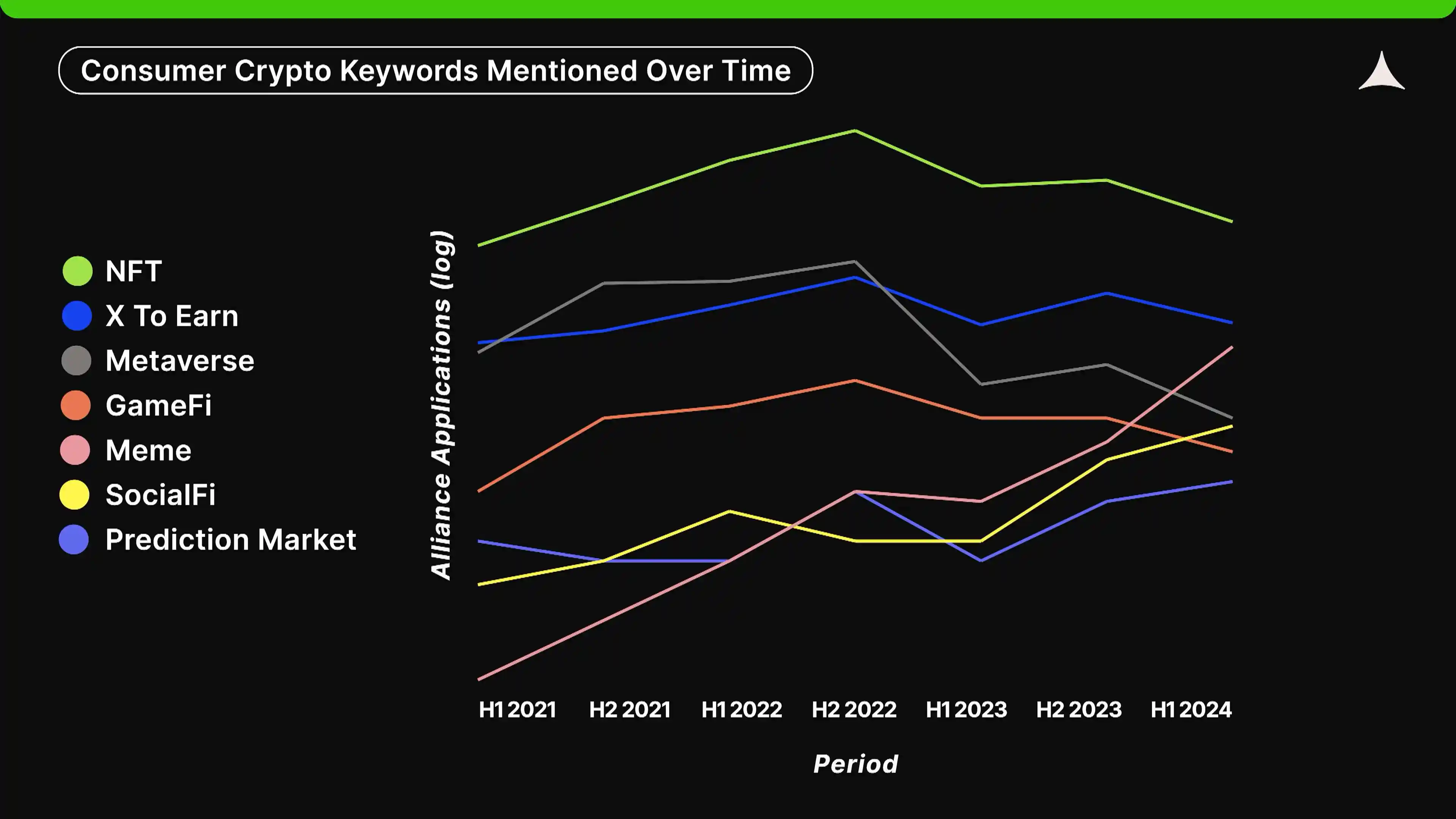 2022 年围绕 NFT 的投机热潮很可能已经被 memecoins 所取代,因为后者具有更低的单价和更高的流动性,得益于其可替代性。「X to earn」和「GameFi」在 Axie Infinity 的推动下达到了**,但令人惊讶的是,「X to earn」的下降幅度并不大。**,「SocialFi」在 2023 年下半年复苏,这很可能与 Friend.tech 的成功有关。