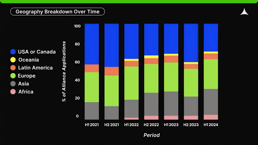 在 2024 年上半年,我们看到来自美国和加拿大的创始人比例降至历史**,仅占 29%。这一比例相比于 2021 年下半年有所下降,而当时来自美国和加拿大的申请者超过 45%。