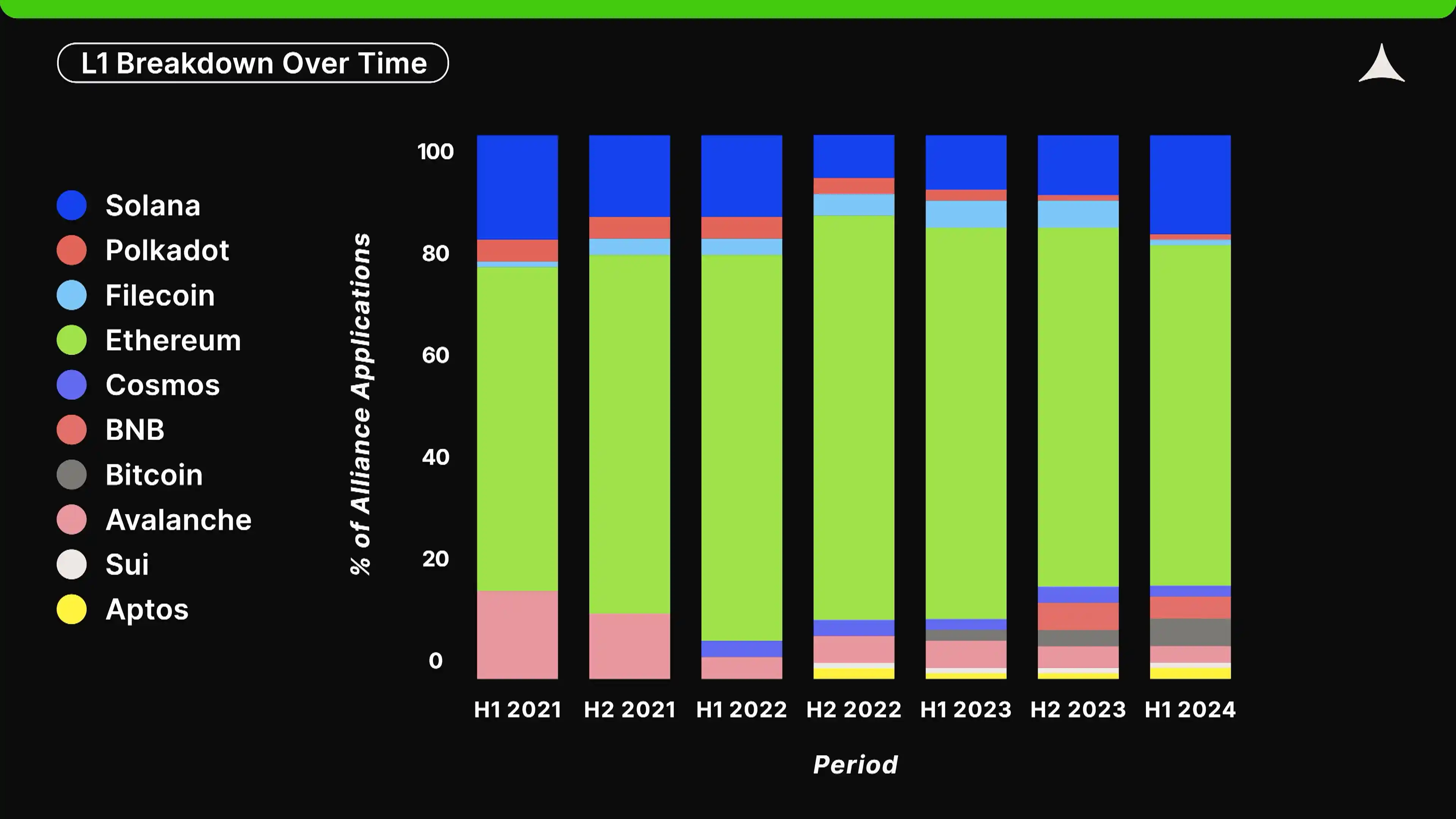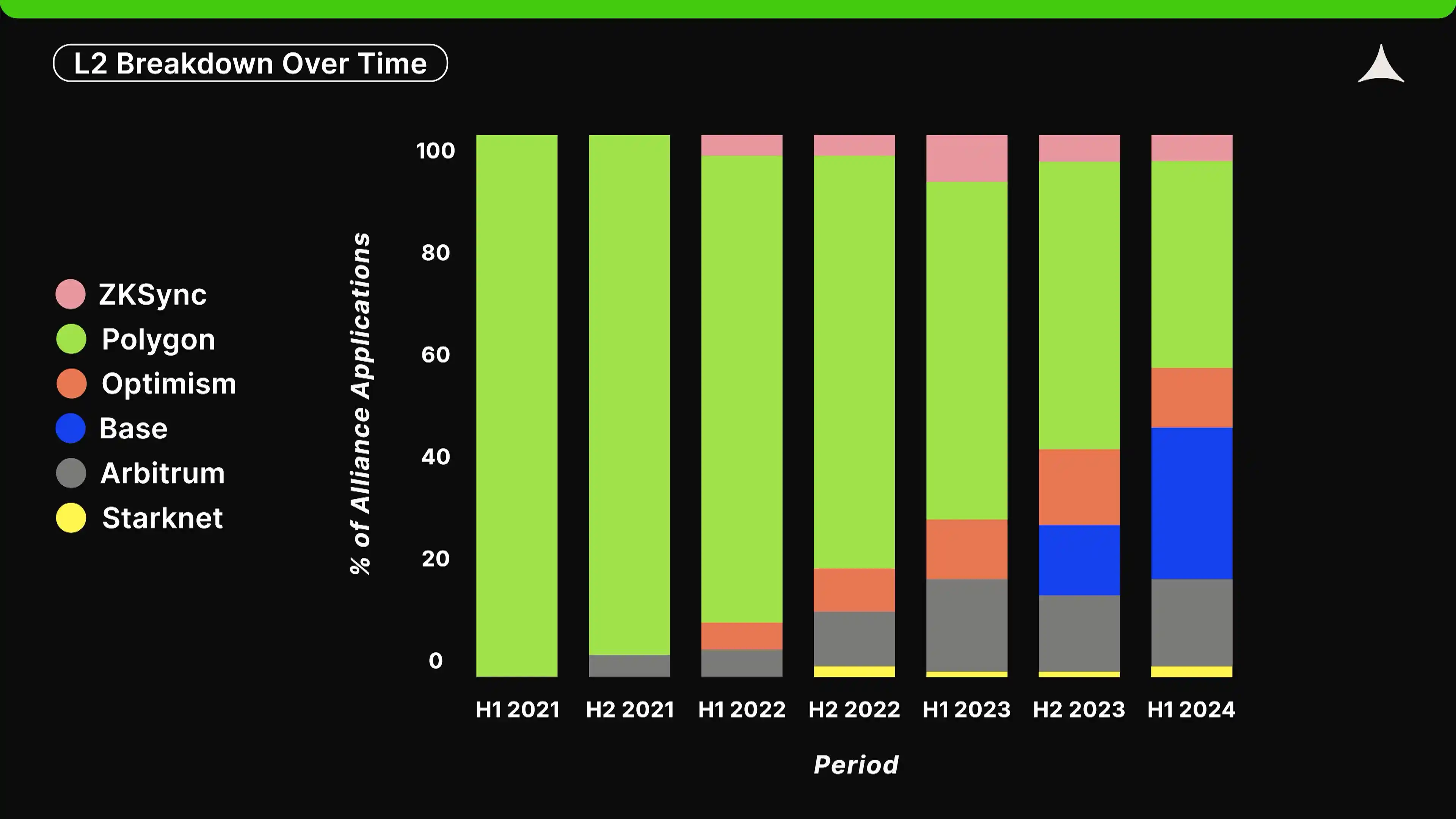 在 Aliance 的早期历史中,初创公司几乎**在 Polygon 上构建。然而,Optimi** Rollup(如 Optimi**、Base 和 Arbitrum)在过去三年中持续获得关注。如今,它们合计占据了 59% 的在以太坊 L2 上构建的初创公司份额。值得注意的是,Base 在 2023 年才刚刚推出,目前已占据以太坊 L2 上初创公司活动的 28%。