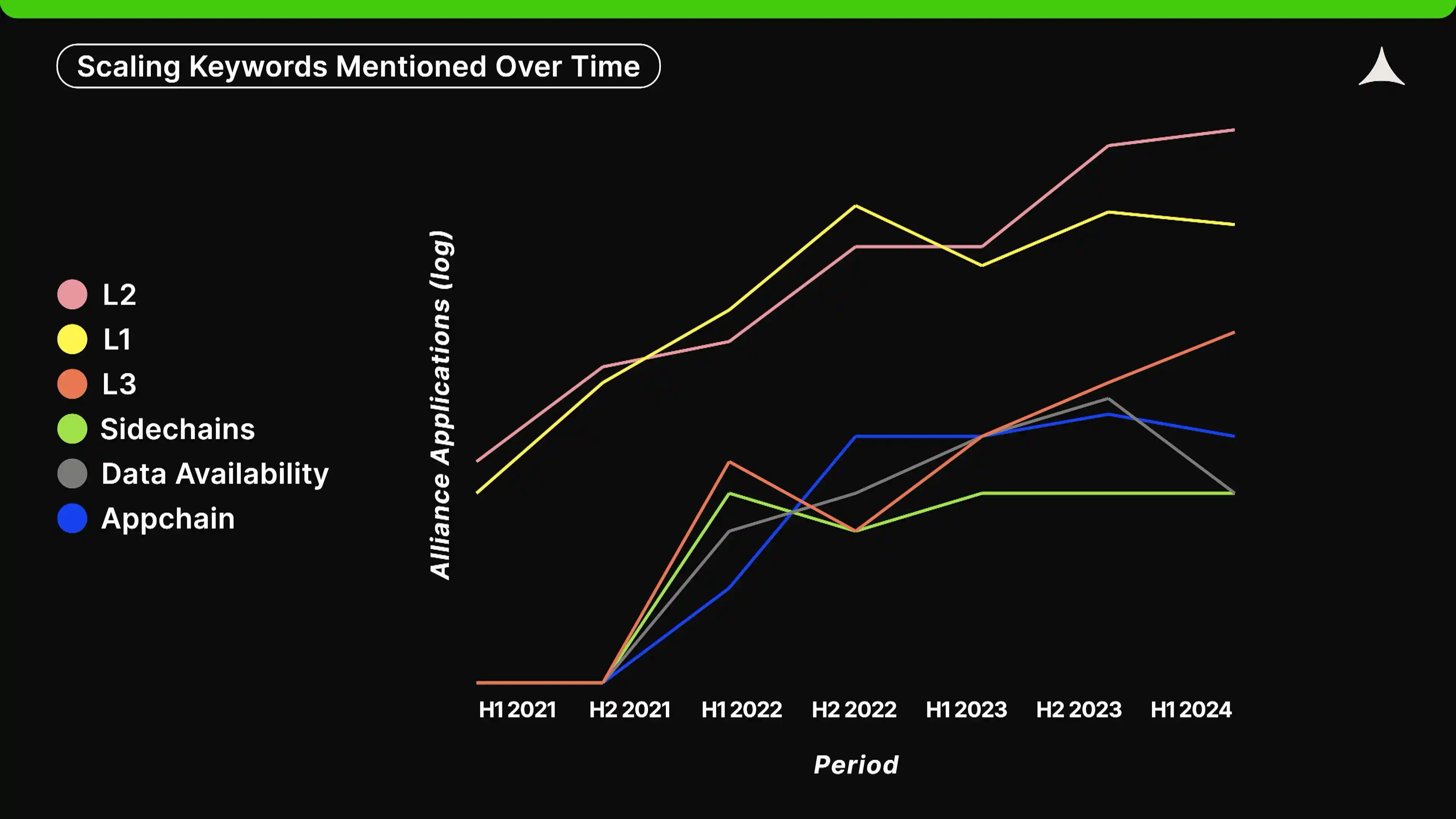 在扩展性领域,「L2」和「L3」显示出强劲的增长趋势,而「L1」在 2022 年下半年达到**后开始停滞。自 2021 年下半年以来,新热词的出现包括「数据可用性」(data availability)、「应用链」(appchain)和「侧链」(sidechains)。