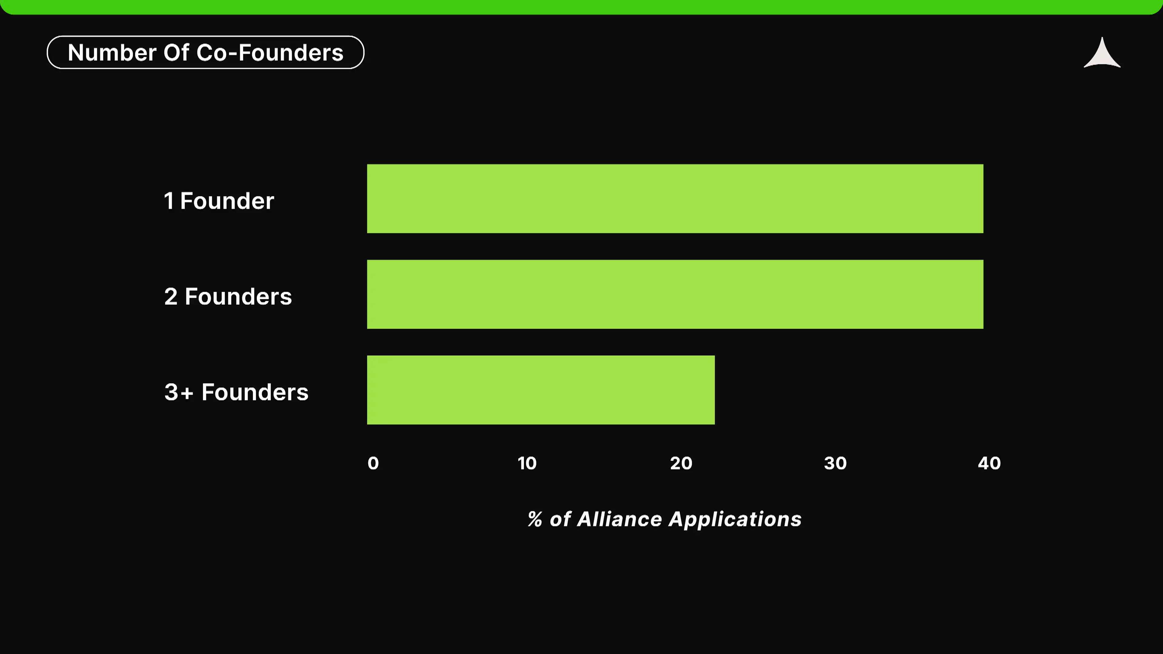 在我们**一届的申请中,39% 的初创企业由独立创始人创办。根据经验,独立创始人一直受到风险投资家的偏见,然而数据显示,他们能够创造超乎寻常的成果:有研究发现,约 20% 的独角兽企业是由独立创始人所创办。此外,他们通常拥有关键员工,而这些员工可能并不被称为联合创始人,但在某些情况下同样具有重要影响。
