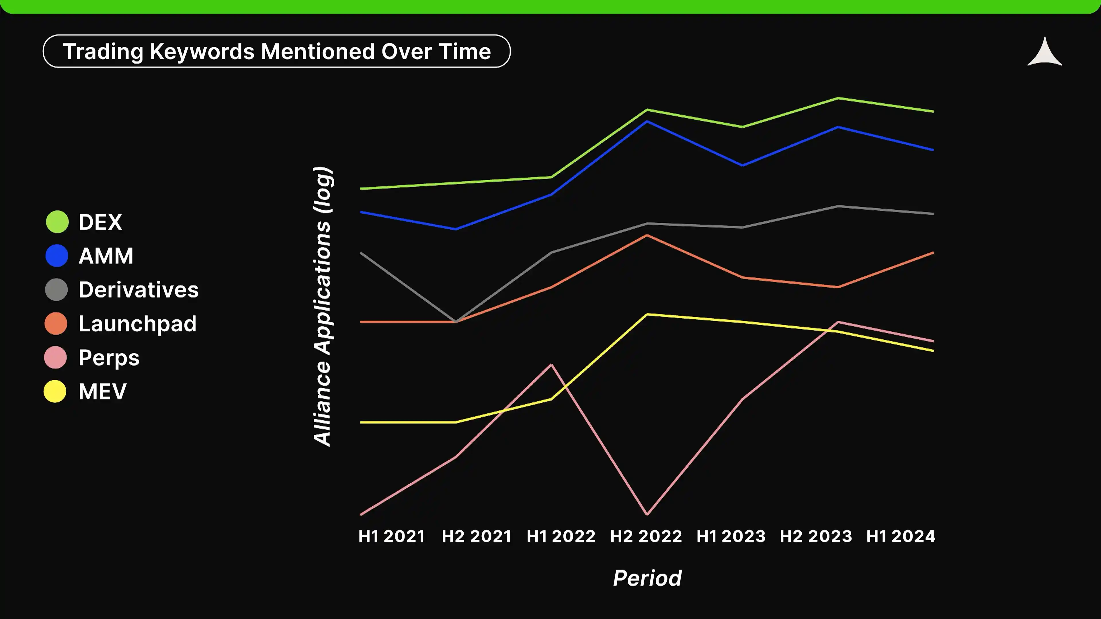 「自动做市商」(AMM)、「衍生品」(derivatives)和「去**化交易所」(DEX)在过去 3 年半里普遍呈上升趋势。相比之下,「**可提取价值」(MEV)在 2022 年下半年达到了峰值,此后在创业者中失去了受欢迎程度。launchpad 在 2023 年略有放缓后再次获得动力。总体而言,交易相关的关键词都在上升,因为这是加密中少数具有明显产品市场契合度的应用之一。**的「launchpad」上升可能与 Alliance 的校友 Pump.fun 的成功有关。