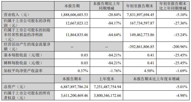 2024年前三季度,华致酒行实现营业收入78.32亿元,同比下滑5.10%;归属于上市公司股东的净利润1.68亿元,同比下滑27.36%;归属于上市公司股东的扣除非经常性损益的净利润1.49亿元,同比下滑15.24%;经营活动产生的现金流量净额为-3.93亿元。