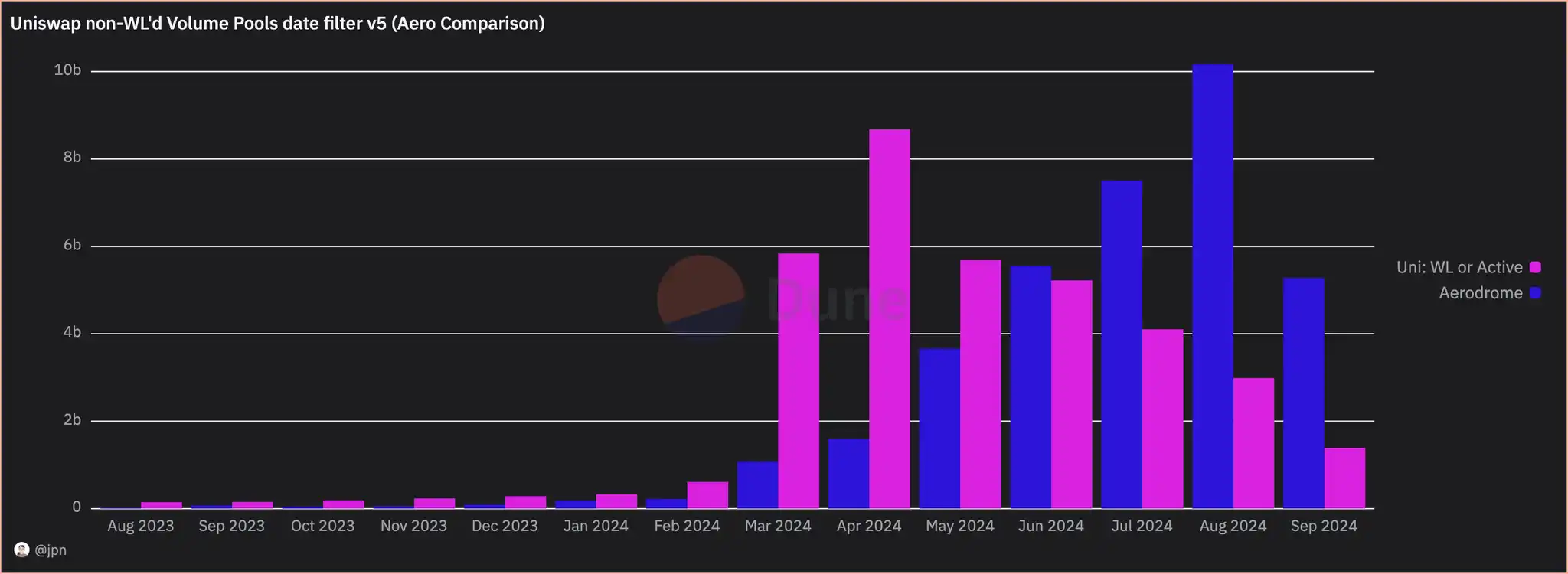 jpn memelord 附上了两组图表,一组显示未经处理的 Uniswap 交易量(通常用于比较这些交易量的数据),另一组则去除了 Uniswap 数据中的 Rug 交易。Aerodrome 的交易量主导地位远比人们想象的要强大得多。