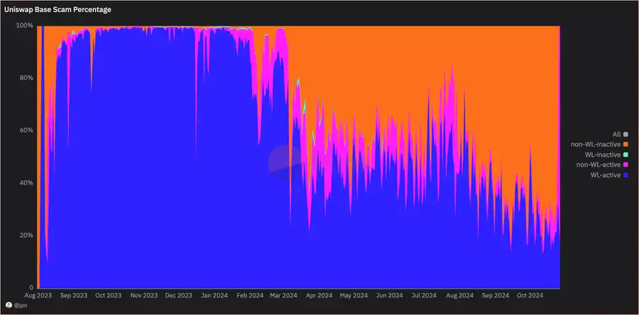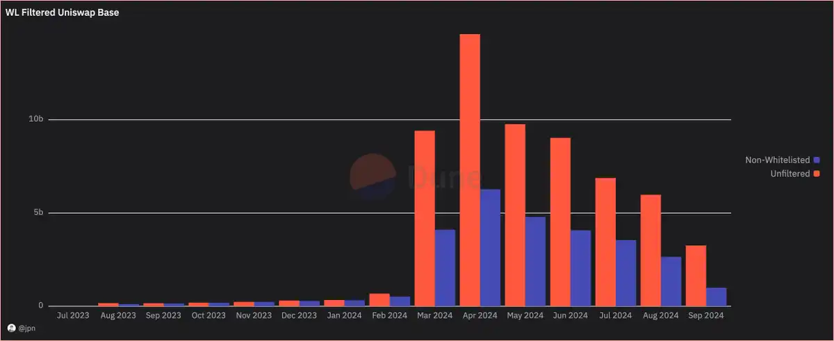 其分析显示,Uniswap 在 Base 上的相当一部分交易量实际上来自未列入白名单的资产。自今年 3 月 Base 上项目爆发以来,这一比例接近 50%。