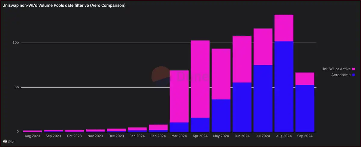 jpn memelord 转向 AerodromeFi 及其白名单流程,试图将其作为过滤 Uniswap 在 Base 上交易量的可能方法。在 Aerodrome 上,若资金池要获得激励,其**需通过 Aerodrome 团队的白名单审核,这有助于将优质项目的交易量与其他项目区分开来。