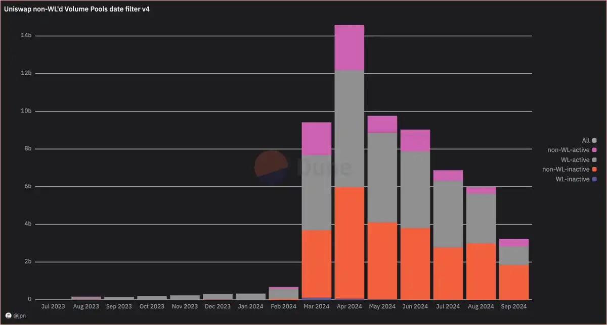 在高峰期,**一次流动性添加事件的资金池每月贡献了约 3 亿美元的交易量,占比相对较小。而截至目前,9 月的这一数据仅约为 3000 万美元,这实际上验证了在 Base 上 Uniswap 创建的约 99% 的资金池都是低价值的。