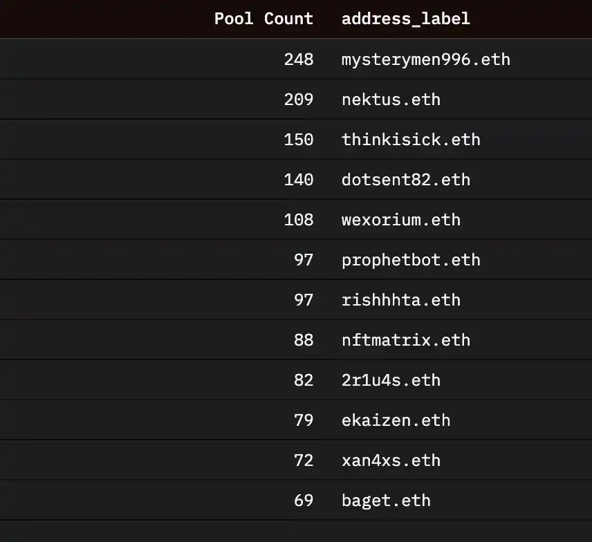 他尝试仅关注由 ENS 用户创建的资金池。这一方法更具成效,** 1.7 万个资金池是由拥有 ENS 的地址创建的,这一数字远低于资金池总数,并可能有效地排除了大多数由机器人创建的资金池。