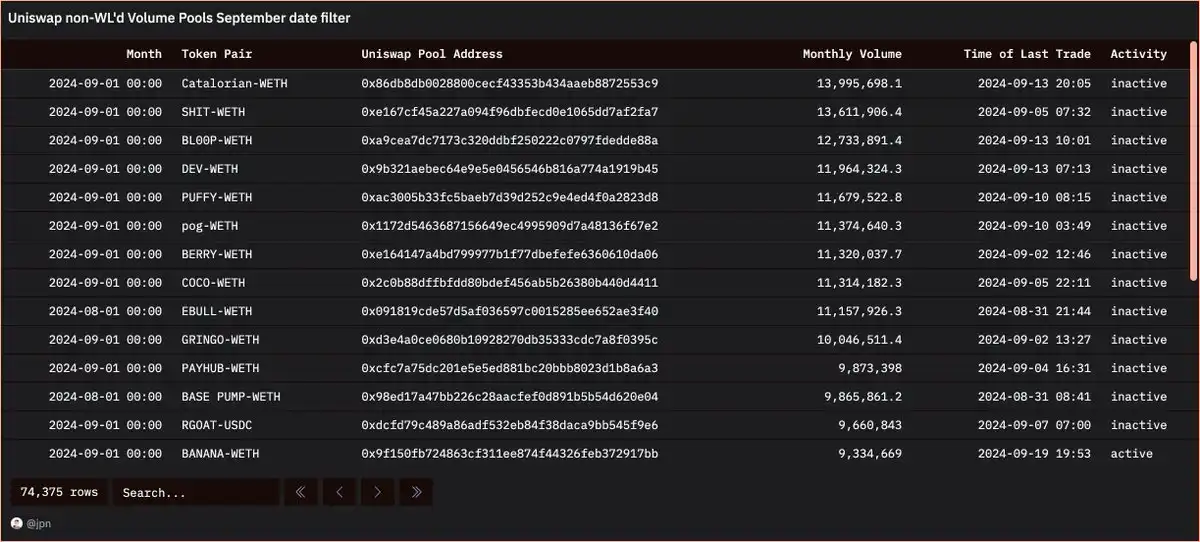 jpn memelord 提取了未列入白名单资产的单个资金池交易量数据,结果发现了大量 meme 币。一些他从未听说过的 meme 币,仅在 9 月的交易量就达到了 1000 万美元。