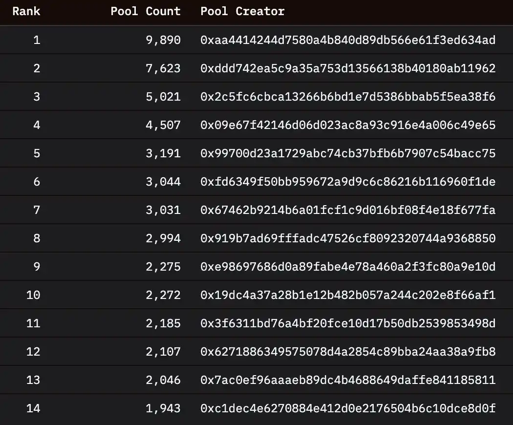综合来看,创建了超过 500 个资金池的地址合计贡献了超过 12.7 万个资金池,在 Base 上部署的所有资金池中,超过 20% 由仅 87 个独立地址(甚至更少的独立实体)创建。