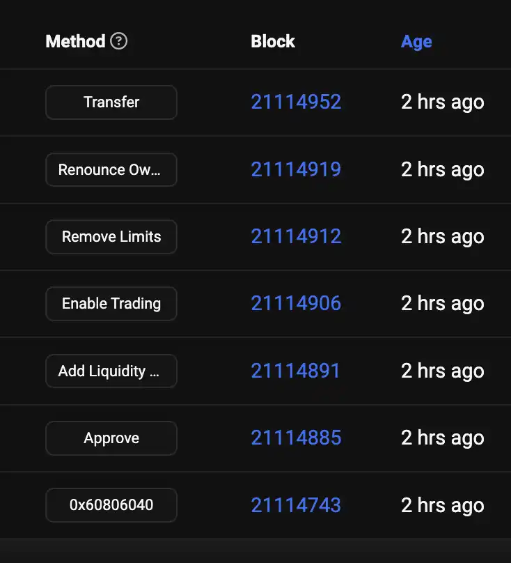 他们的操作开始于部署一个**,奇怪的是,采用了非标准的 9 位小数,并将大部分流动性添加到 Uniswap v2 池中。随后,他们开启交易,放弃合约的所有权,并销毁流动性**,这一系列操作看起来像是一个合规的设置。