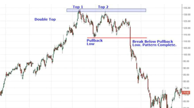 技术分析师使用图表来帮助判断在投资中何时应该做多或做空。例如,技术分析师可能会寻找所谓的“双顶”作为即将到来的价格下跌的指标。如下图: