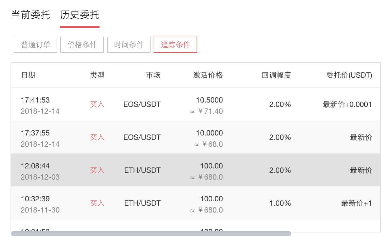 已触发的追踪订单都会进入历史委托中,可以在历史委托页面进行追踪单历史委托查询,要查看追踪单成交记录,需到限价单里面查询。如下图为追踪单历史委托信息: