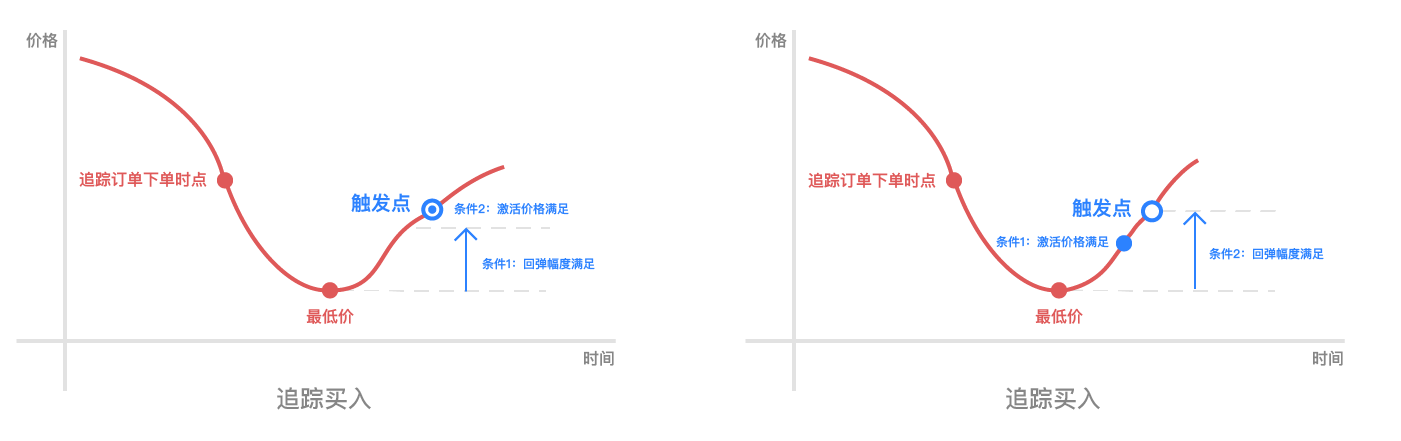 追踪订单是针对市场行情回调自动执行的策略订单,用户可以设置回调幅度和激活价格(可选),当设置的条件满足后,就会触发订单的执行,自动进行委托下单。