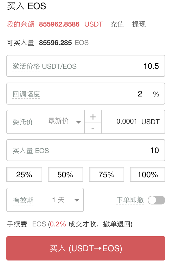 如上图所示,用户A设置追踪订单,当EOS市场价格从11美元继续下跌,**跌至10美元,随后反弹上涨,若上涨至10.2美元,此时回调幅度为(10.2-10)/10=2%,但因为此时的市场价格10.2美元<激活价格(10.5美元),因此系统不会触发此委托。若市场行情继续上涨到10.5美元,系统才会触发此委托。