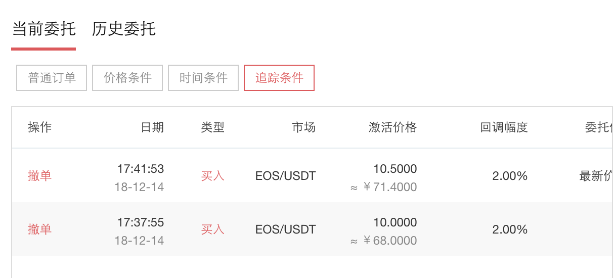 未触发追踪订单都显示在当前委托页面,如: