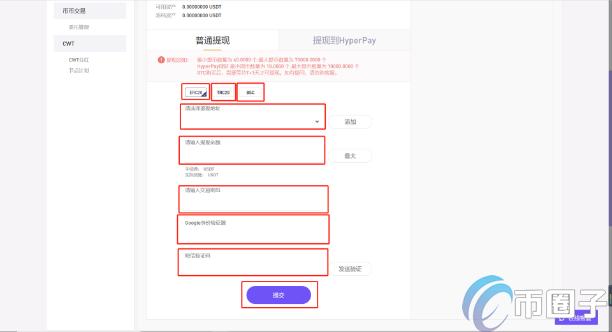 3、然后选择提现币种的“主链”,添加“提现地址”,依次输入“提币金额”(不同币种拥有不同的**提币额度),“交易密码”,“谷歌验证码”以及“短信验证码”,**点击提交即可;