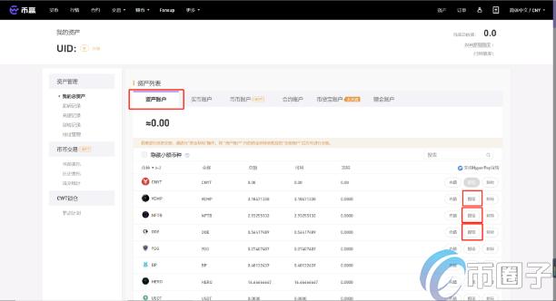 2、进入资产总览,依次选择“资产账户”,点击需要提现币种右方的“提现”按钮;