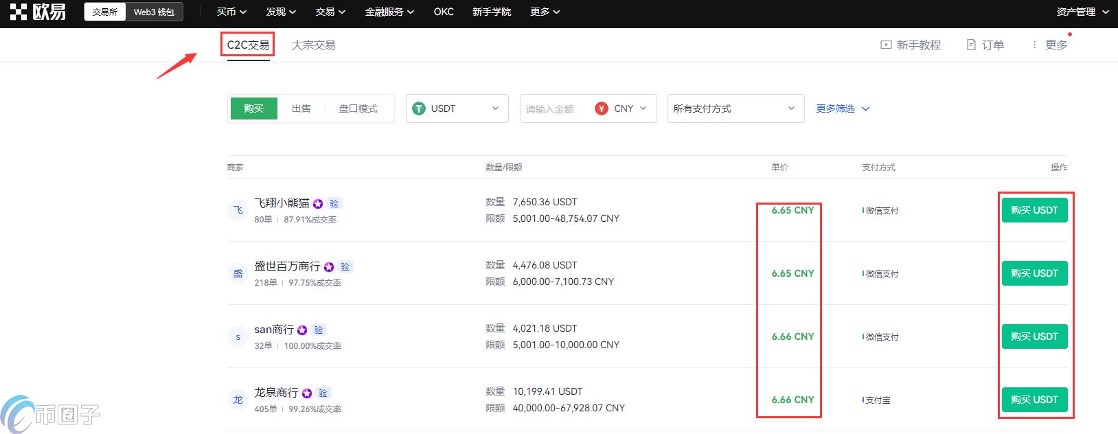 4.完成以上注册、身份认证流程即可交易,在首页中点击【买币】--【C2C买币】进入自选买币页面。