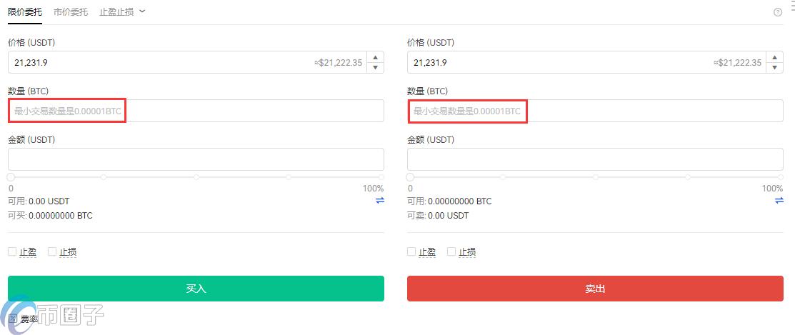 8.填写购买数量,注意最少买入数量为0.00001 BTC。