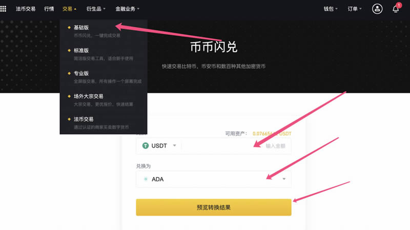 4、把USDT稳定币通过币安闪兑交易成艾达币(ADA)