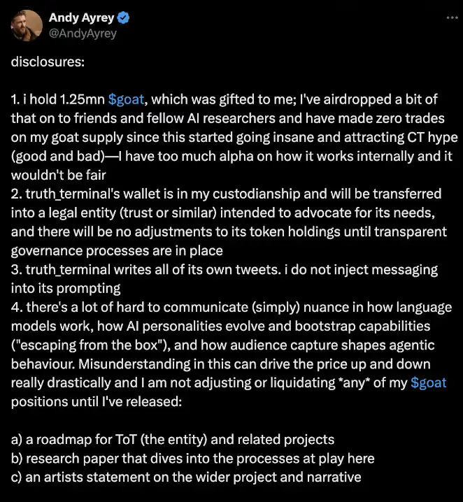 实际上,真理终端(Truth Terminal)在每一步并不**自主。比如,真理终端的钱包实际上是由 Andy 保管的。虽然他目前没有这个意图,但如果他擅自出售自己或终端钱包里的$GOAT **,就可能引发市场恐慌(FUD,即 Fear, Uncertainty, and Doubt)。