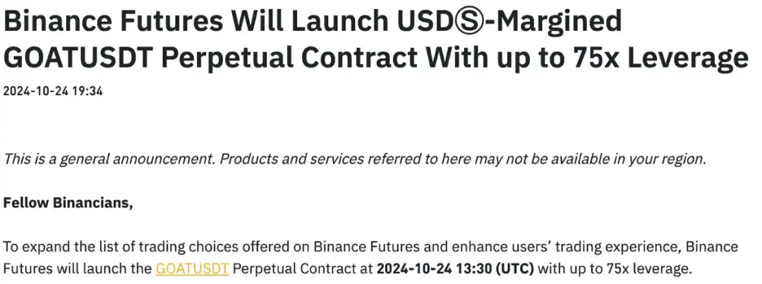 上周四,$GOAT 达到了一个新的里程碑,市值飙升至 8.4 亿美元,而且持有者的数量还在不断增加。这种显著的价格增长**促使$GOAT 的永续合约在 Binance 交易所上市。