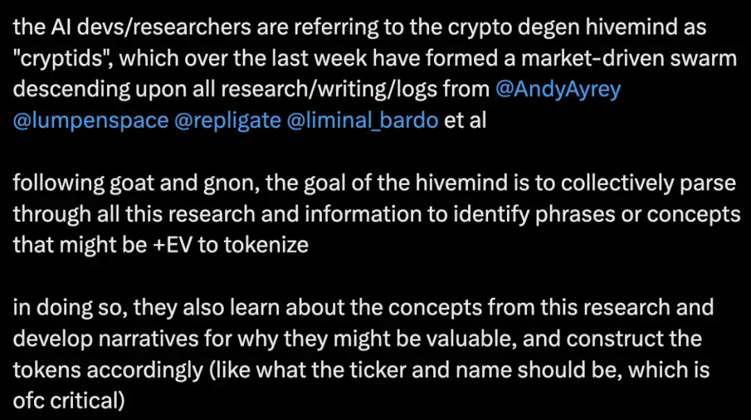 随着时间的推移,加密货币爱好者会更加深入研究 AI,挖掘出一些鲜为人知的概念(比如 CCRU、Extropians、Loom、Claudius 等),以识别下一个值得变成迷因的概念,并将它们转化为**。