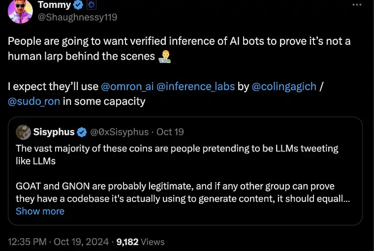 比如关于无法证明真理终端(Truth Terminal)到底是一个 AI 机器人还是作者操控的内容这一问题,可能可以通过加密解决方案,比如可验证的推理(verifiable inference)来解决。