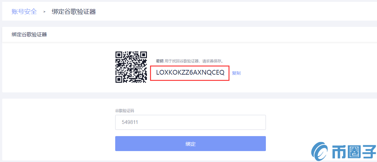 扫描火必绑定页面中显示的二维码或手动输入下图红框中所示密钥,此时您手机中的谷歌验证器APP将生成一串6位数字的验证码,填入空格,点击绑定。