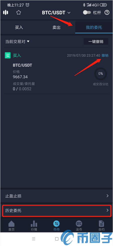 9.如果下单后没有立即成交,可以在【我的委托】中查看当前委托,在这里可以撤销。成交后可以在【历史委托】中查看成交记录。