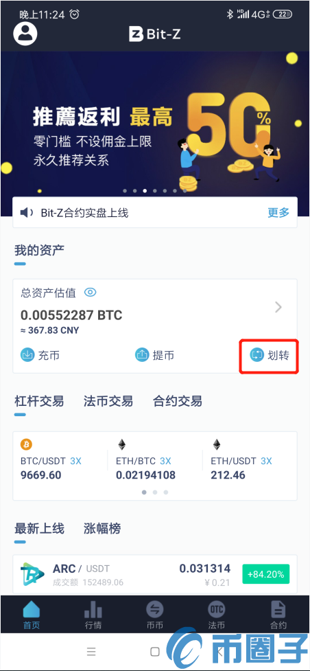 1. APP登录后,先在首页找到【划转】入口,点击进入。